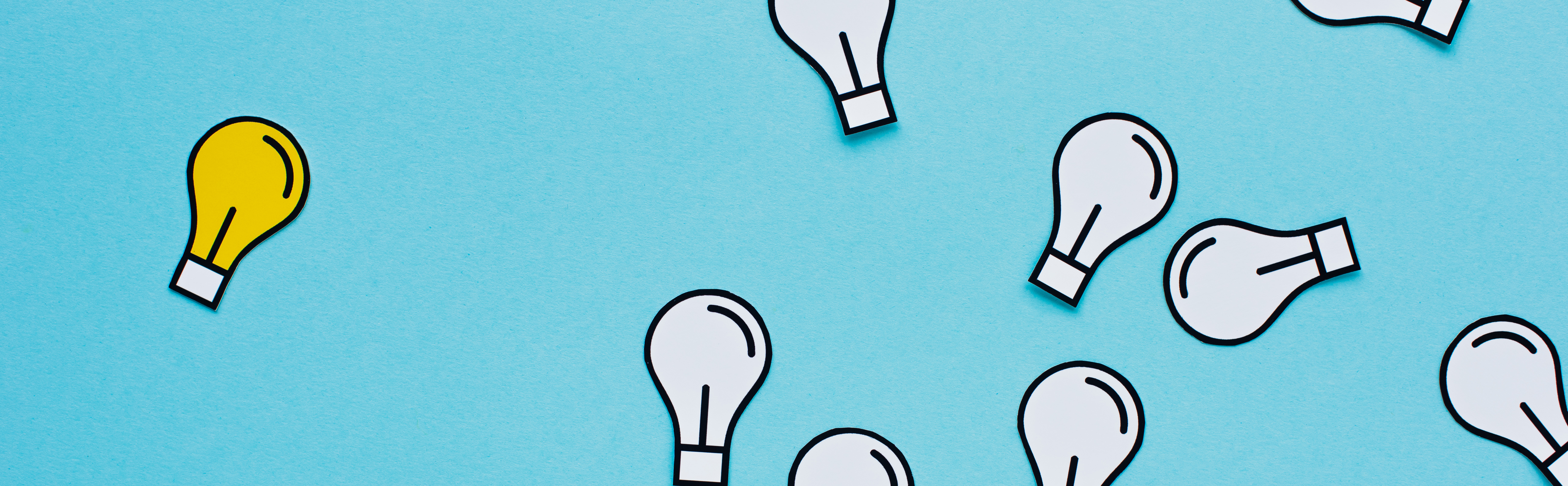 panoramic shot of paper light bulbs scattered on blue background, business concept