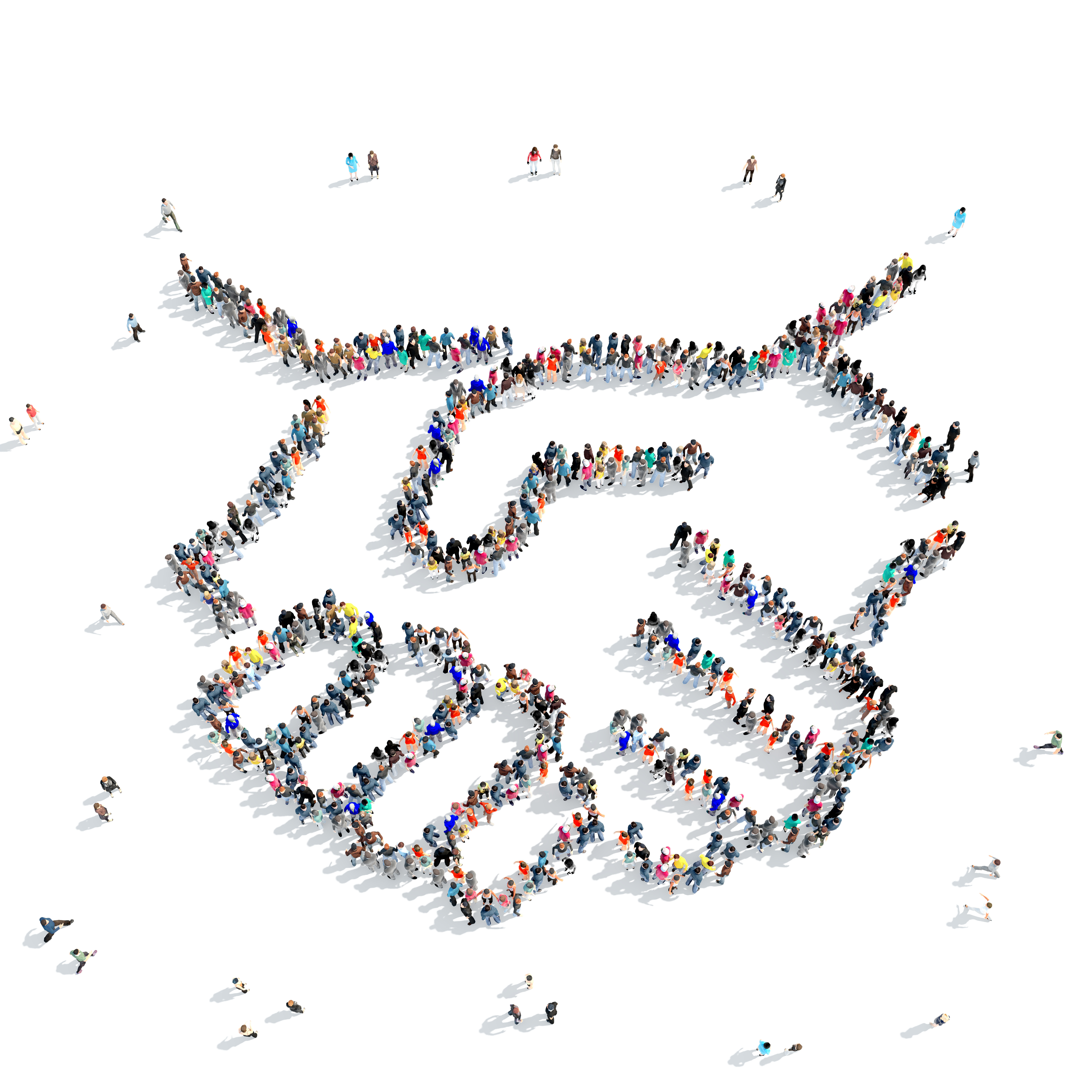 A large group of people in the shape of a handshake, partnership, icon, isolated on white background, 3D illustration.