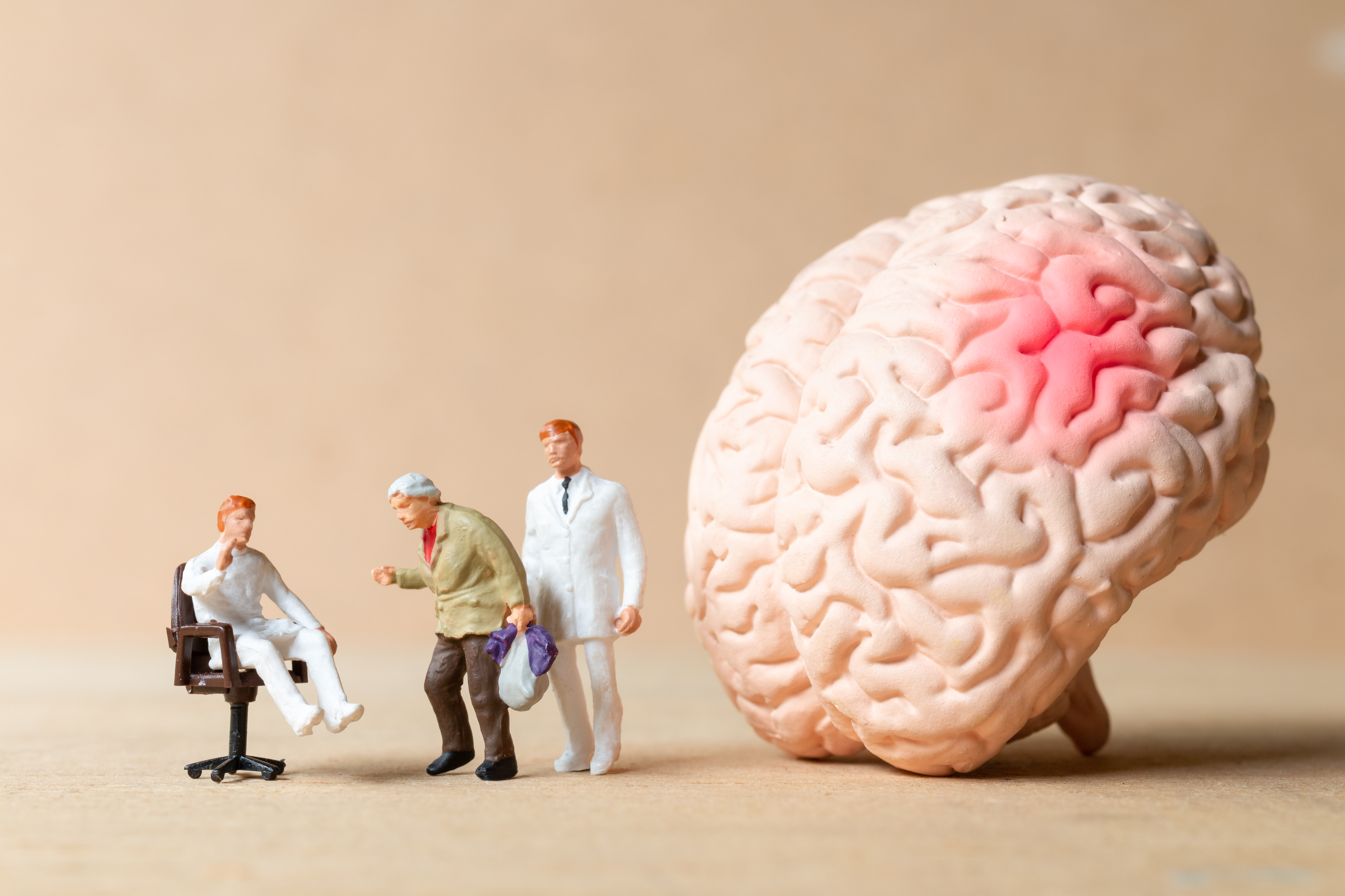 Miniature people Surgeon spoke with patient about brain injuries. World Stroke Day concept.